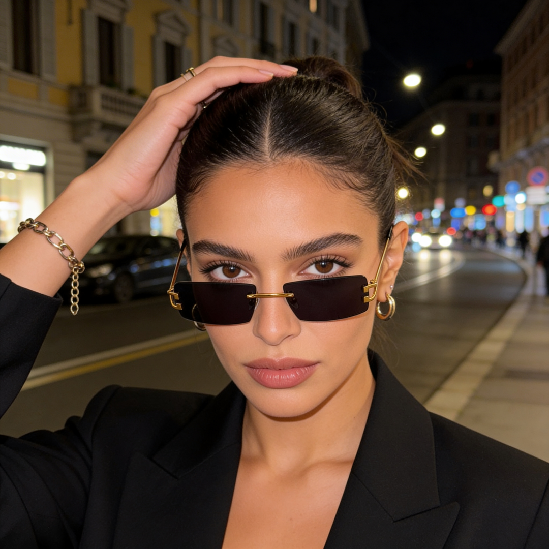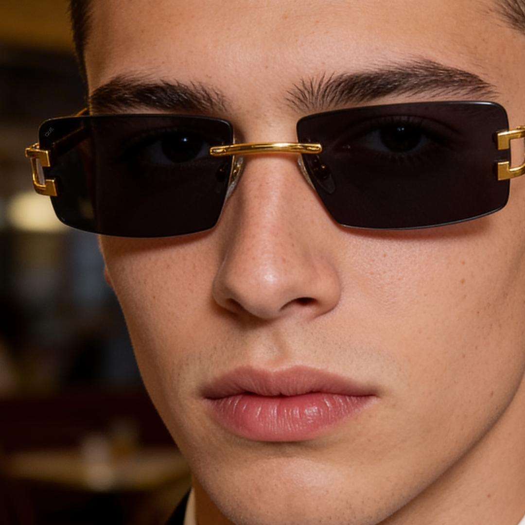 🖤 The rimless cut and gold detailing make it ideal for both streetwear and upscale looks.