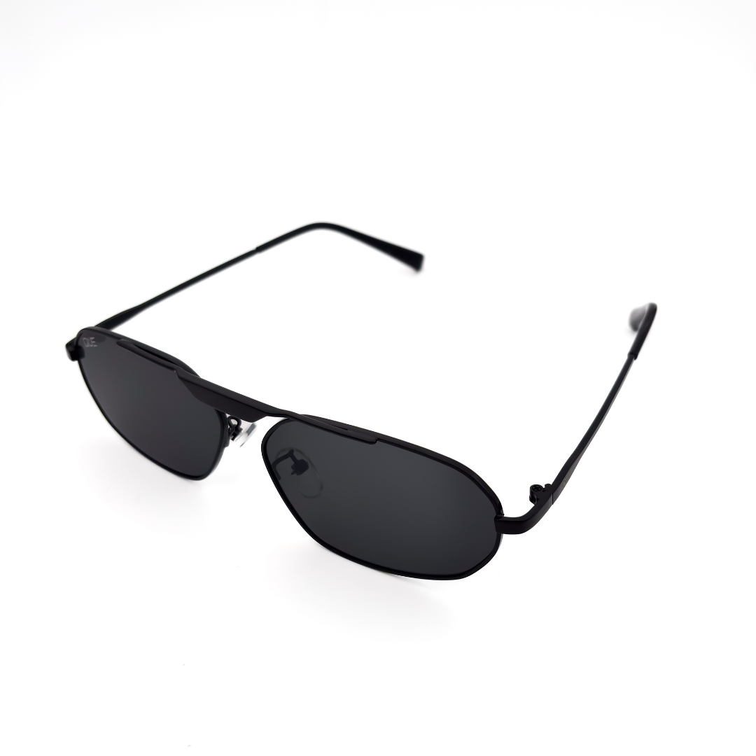 Que Shadow sunglasses feature a sleek matte black aviator frame with a bold structured top bar and deep dark lenses. Designed for those who prefer silent dominance over loud statements.