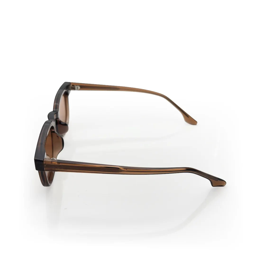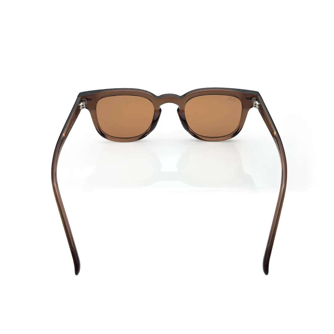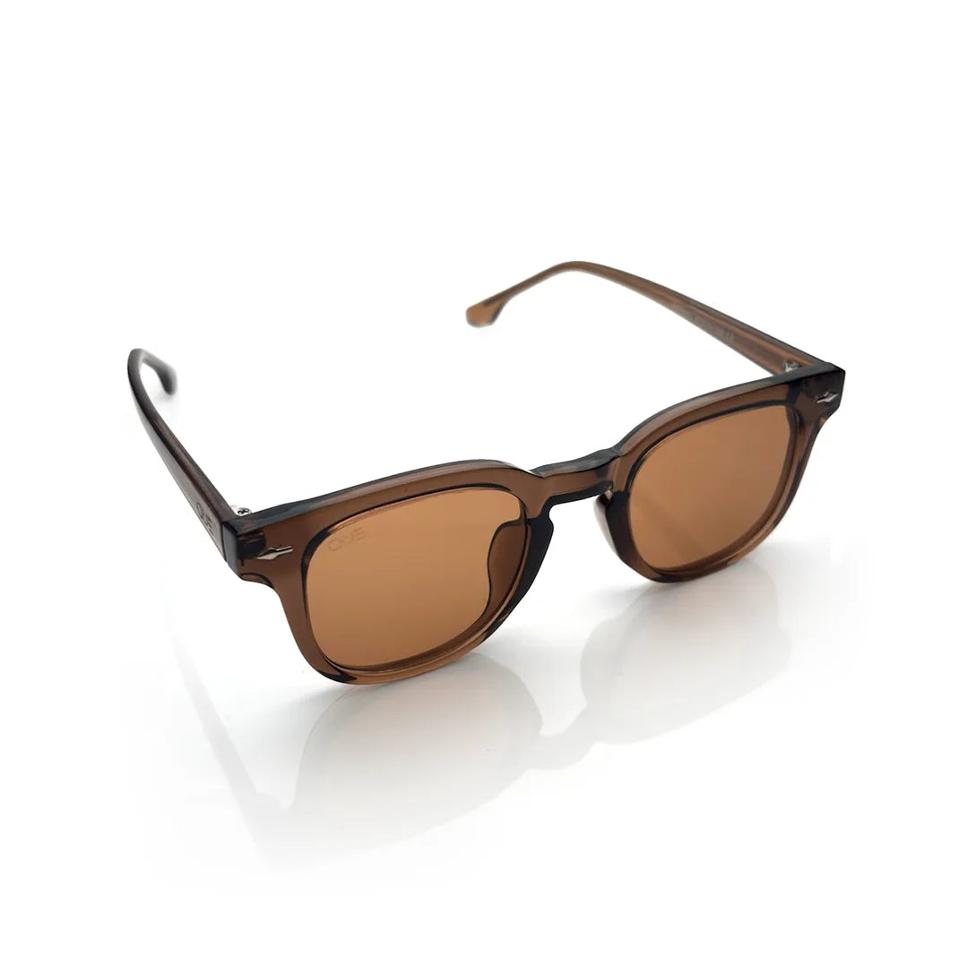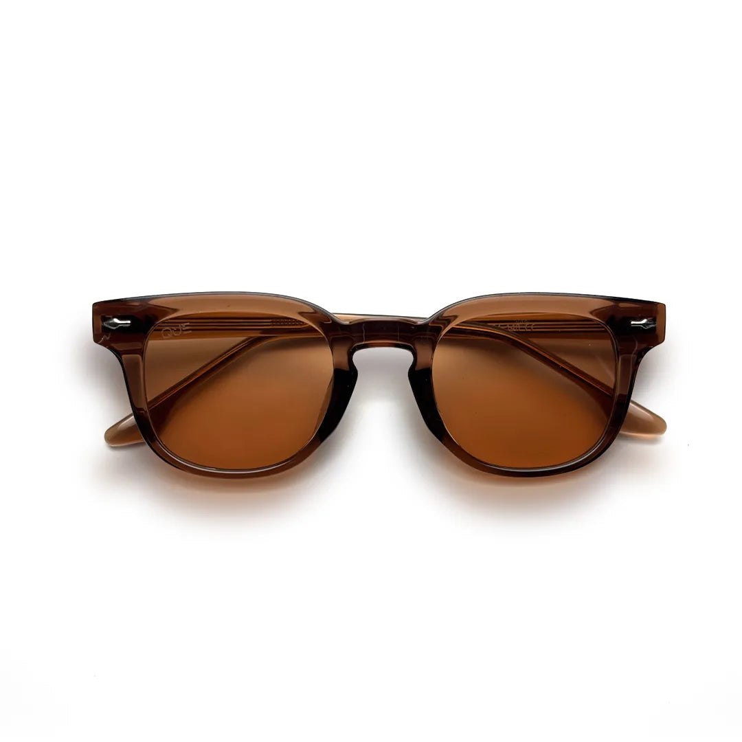 Que Tone sunglasses feature a translucent brown frame with warm-tinted lenses that add instant depth to your look. The round silhouette with a subtle brow detail keeps it clean, balanced, and effortlessly stylish.