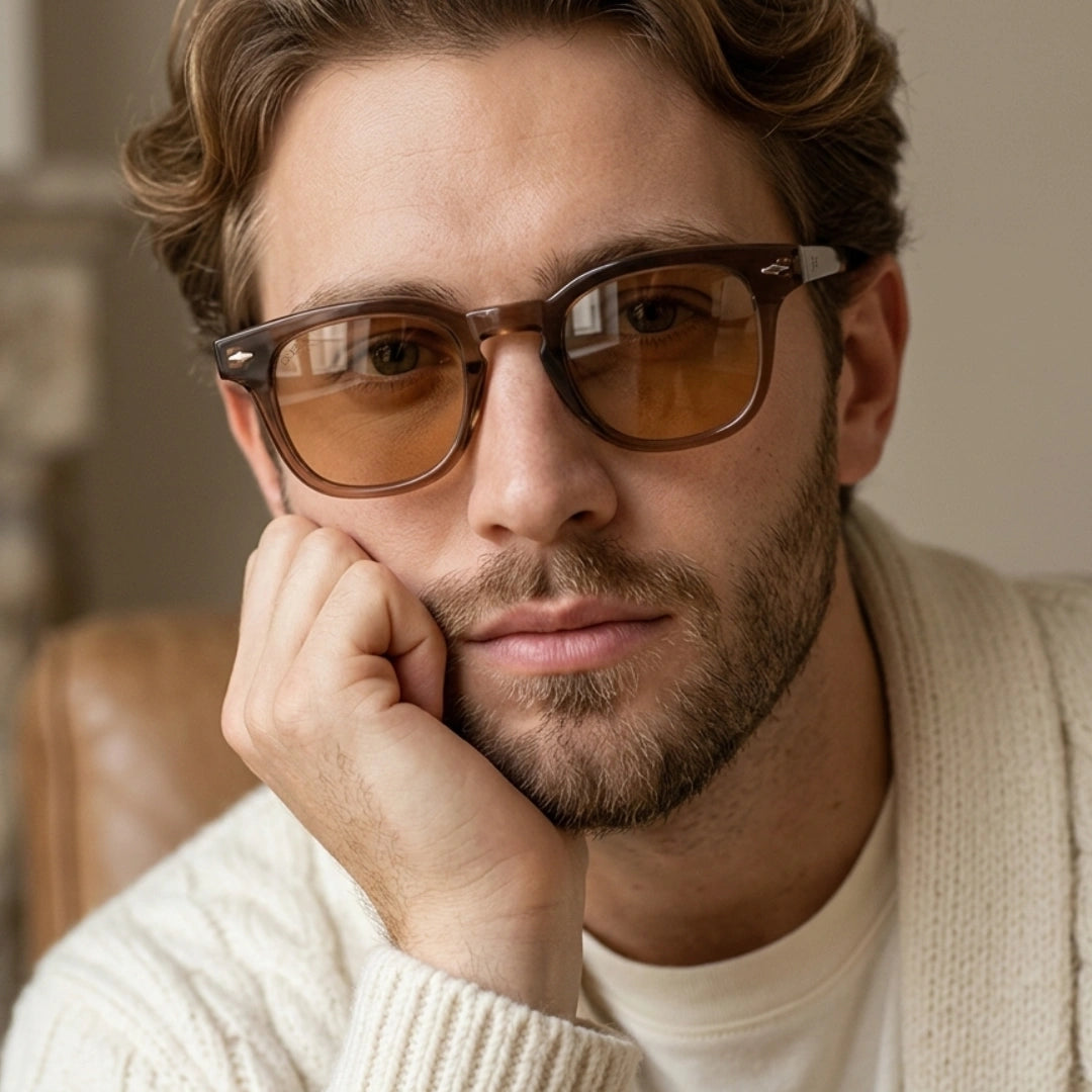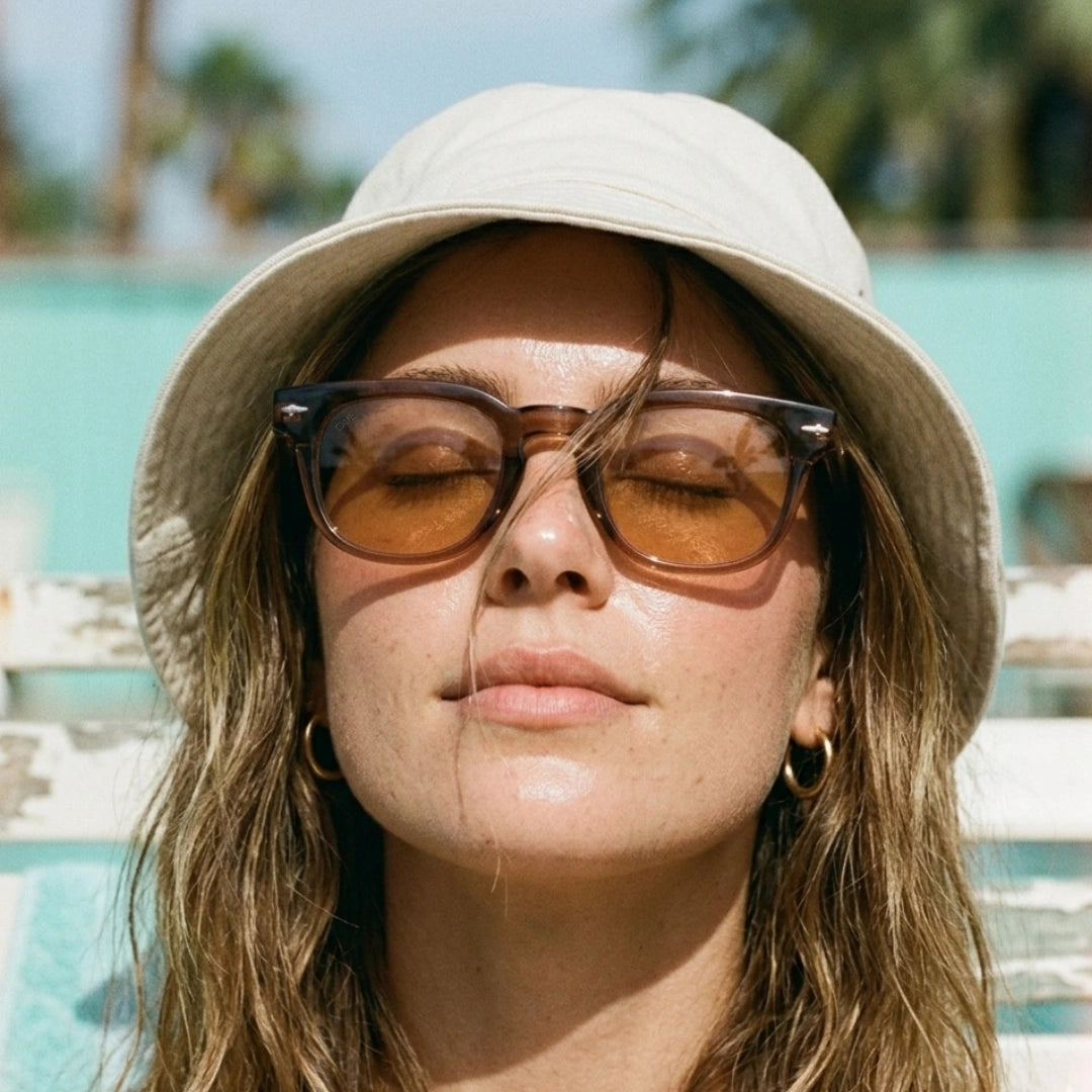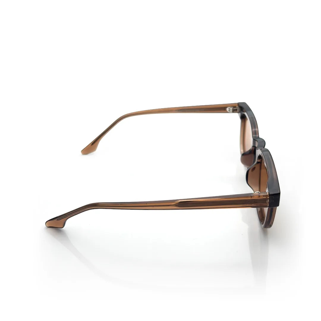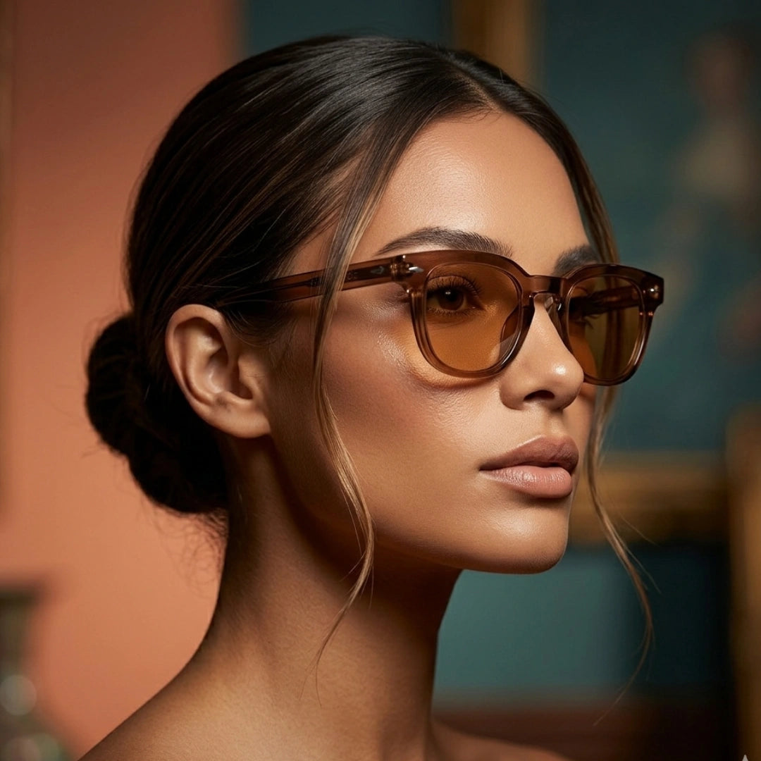 Que Tone sunglasses feature a translucent brown frame with warm-tinted lenses that add instant depth to your look. The round silhouette with a subtle brow detail keeps it clean, balanced, and effortlessly stylish.