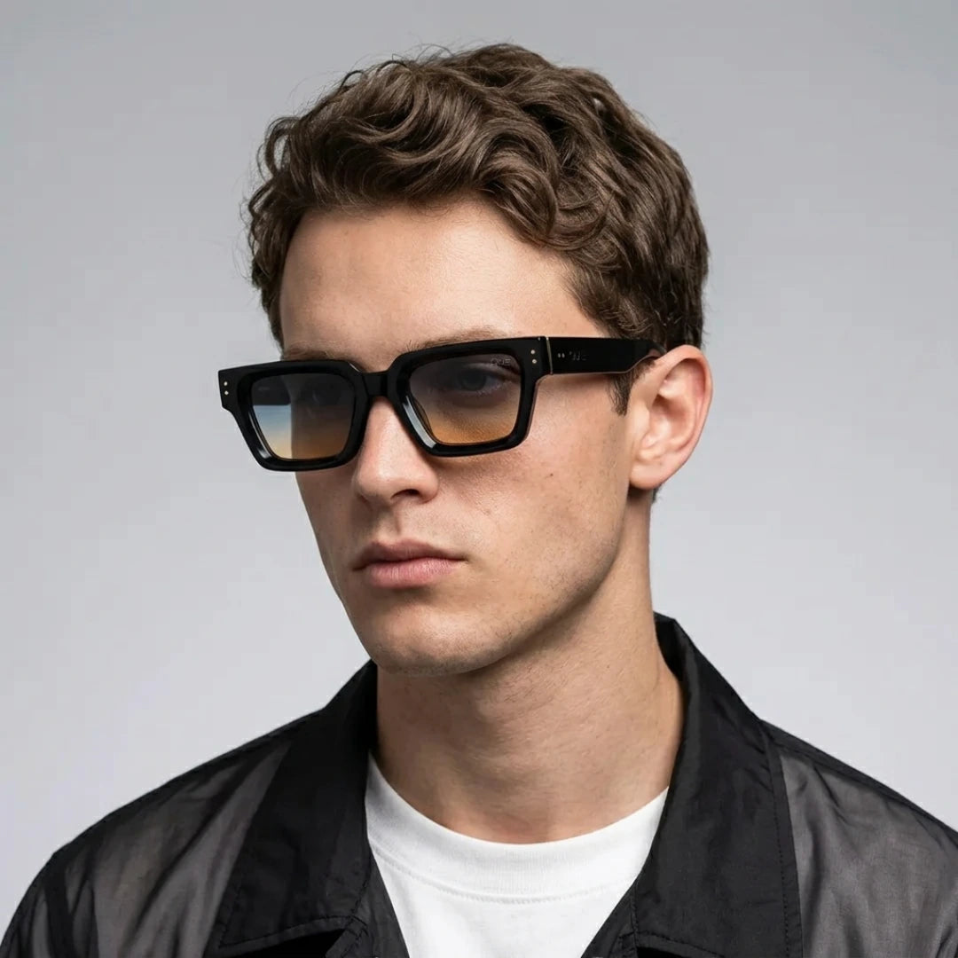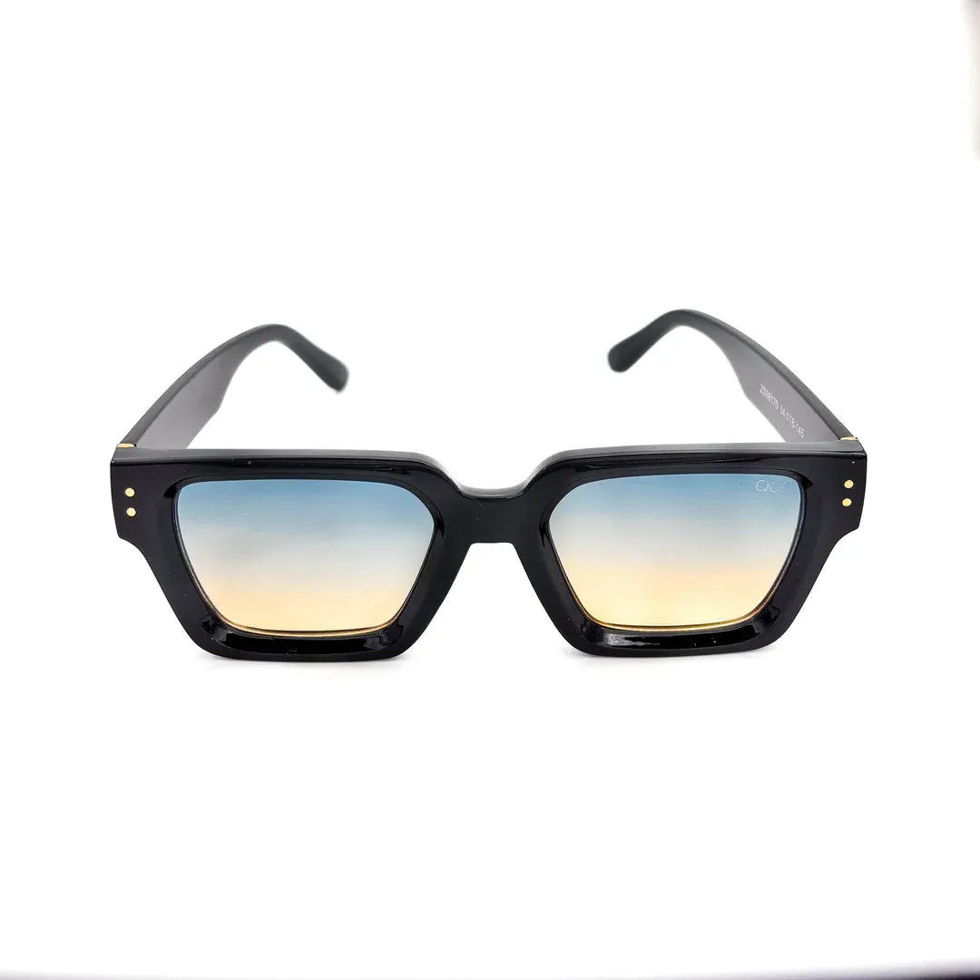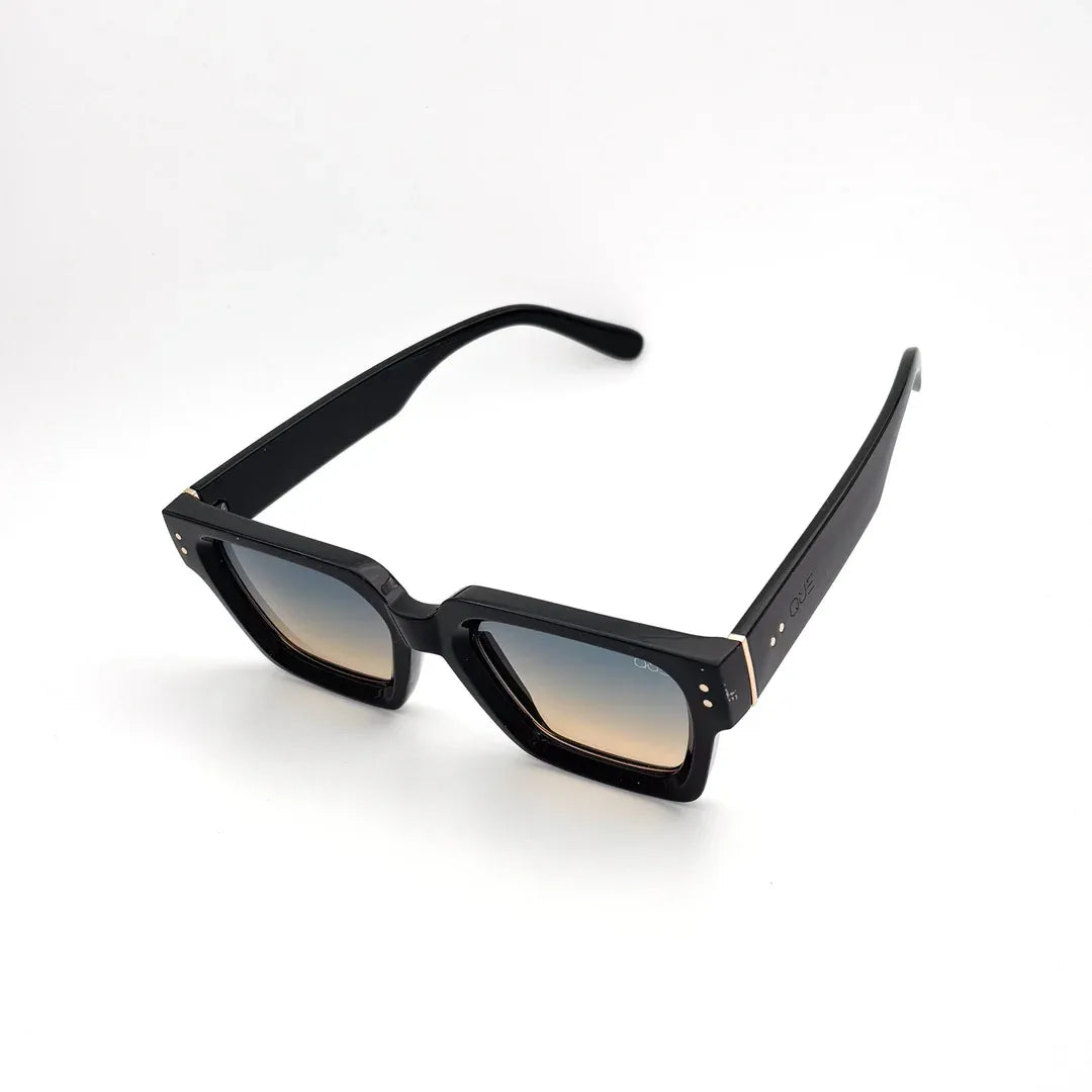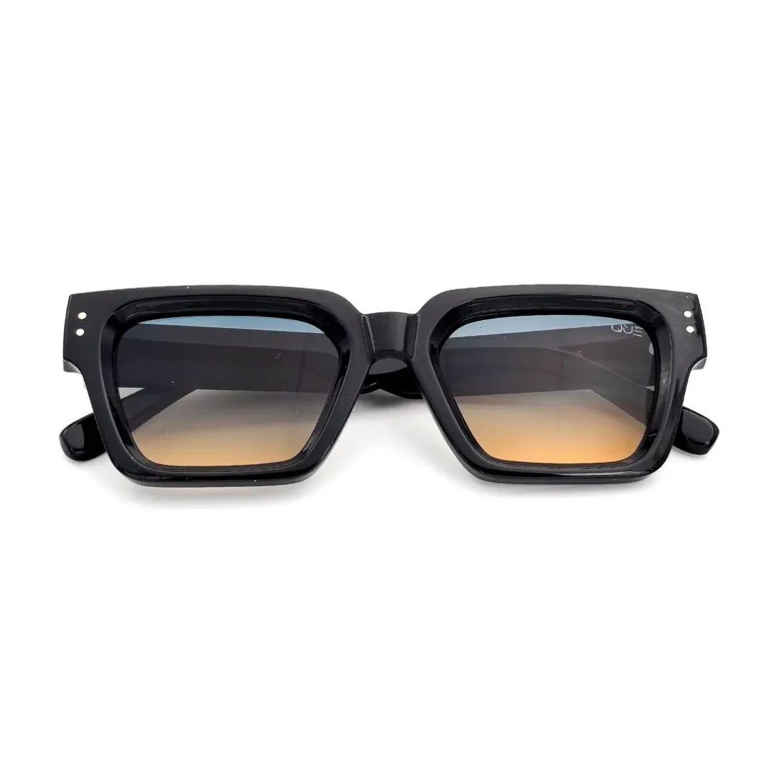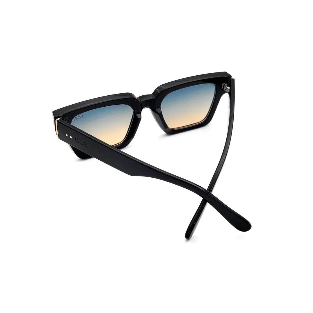 Que Bound breaks convention with its bold geometry and gradient lenses that shift from sky blue to warm amber. The high-gloss frame with gold accents gives it a powerful yet versatile edge. UV400 protection and precision design keep it functional while turning heads.