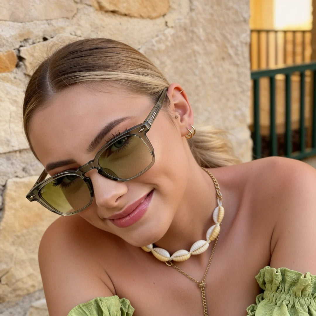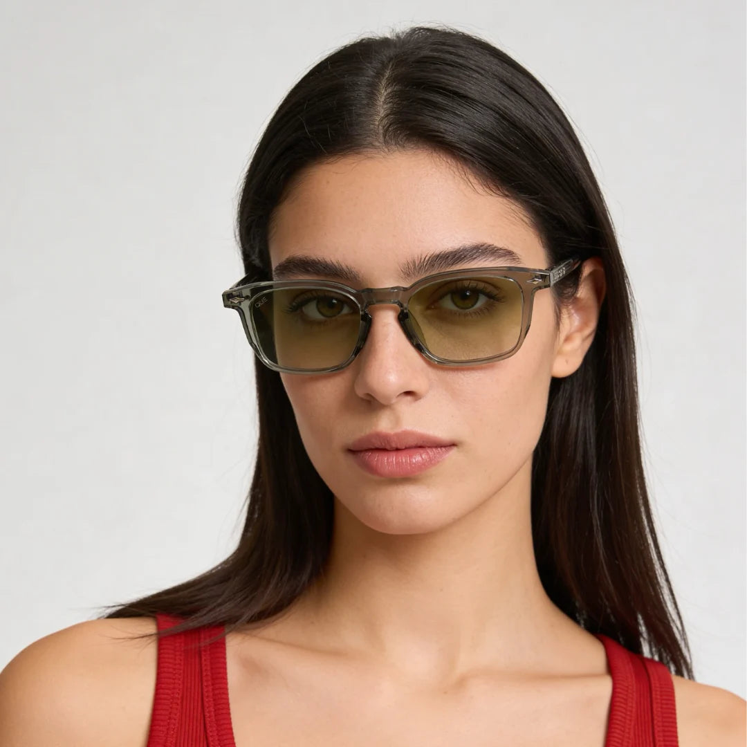 Que Breeze sunglasses feature a translucent sage frame paired with soft green gradient lenses for a fresh, modern aesthetic. Minimal yet distinctive, this sunglass adds a relaxed luxury vibe to your everyday style.