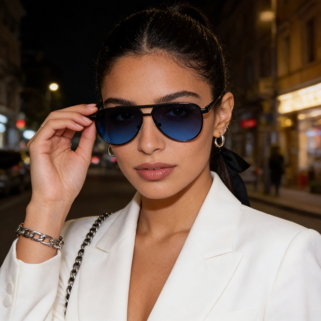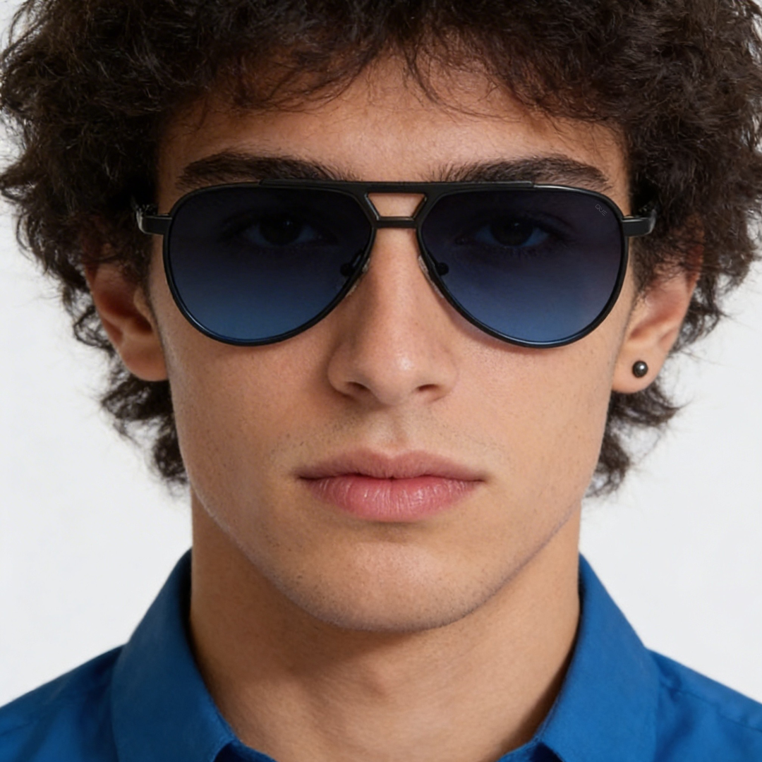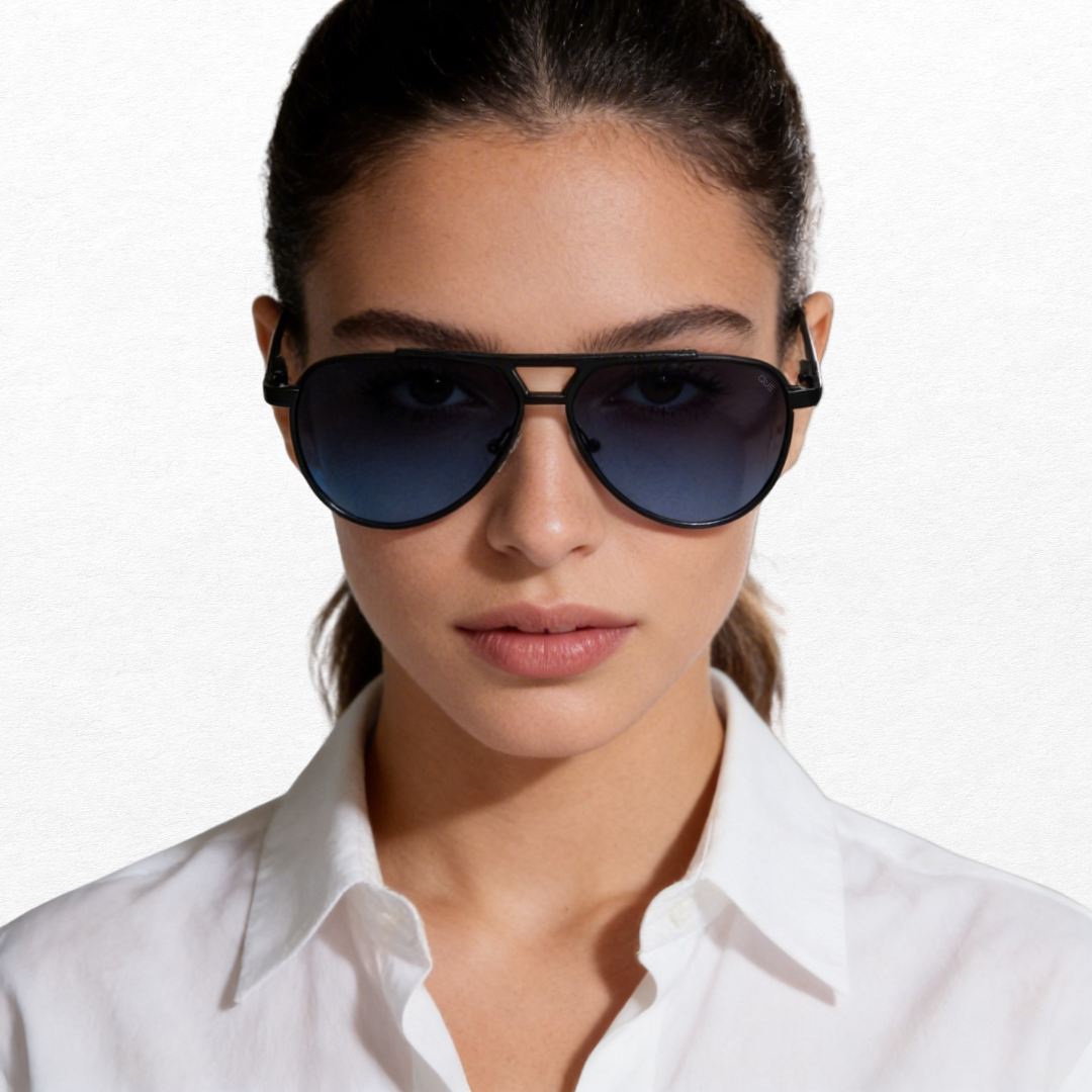 Que Lightline brings a powerful update to the classic aviator shape with its double bridge cutout, sharp metal lines, and deep midnight frame that creates instant presence. The blue gradient lenses add a calm, premium tone while keeping visibility clear in bright outdoor light. Lightweight yet durable, the frame is designed for all day comfort without losing structure.