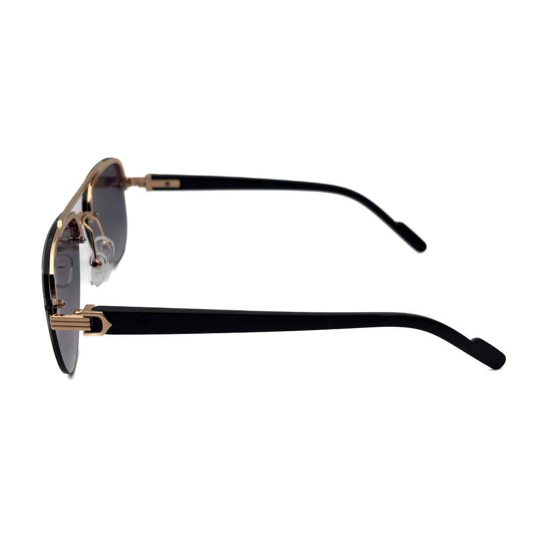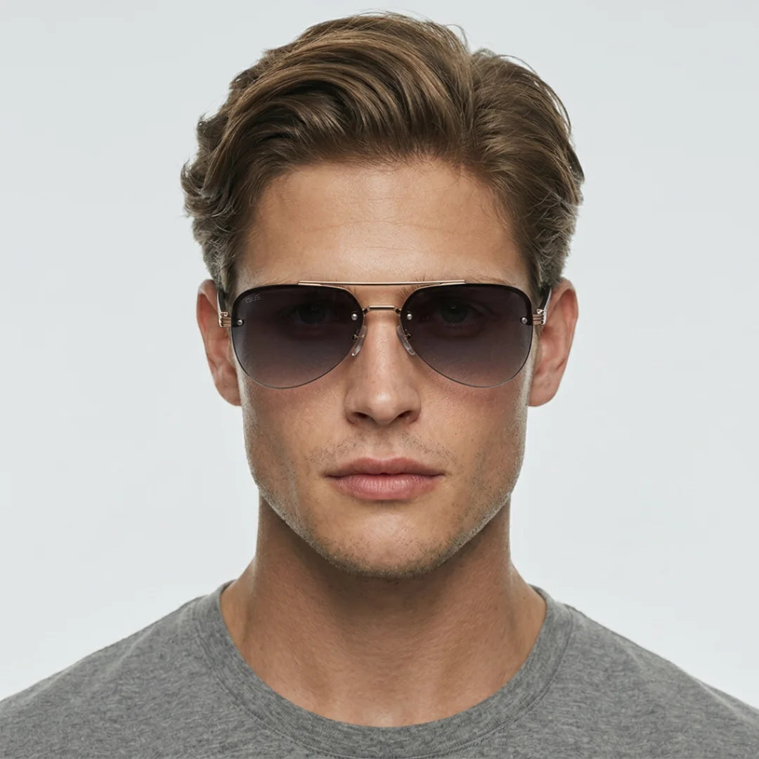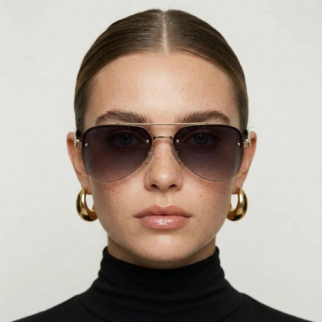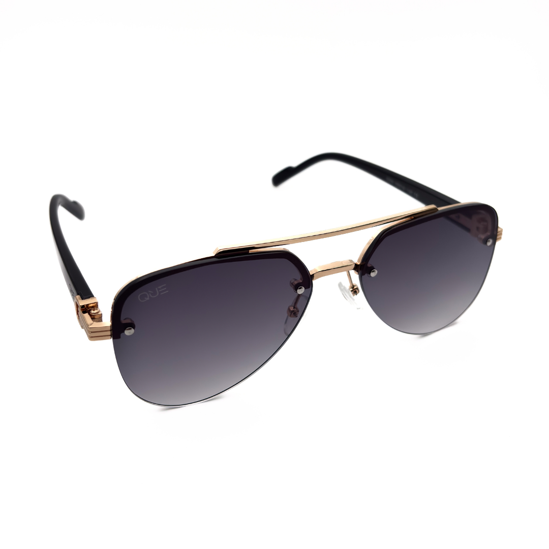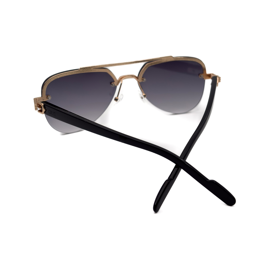 Que Muse sunglasses feature a refined gold metal frame with a bold structured top bar and deep gradient lenses. A modern take on the classic aviator, designed for those who move with quiet confidence.