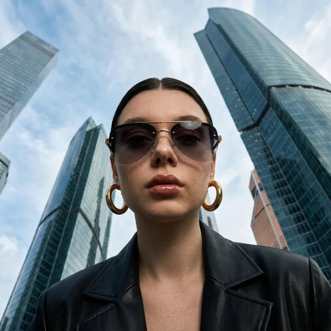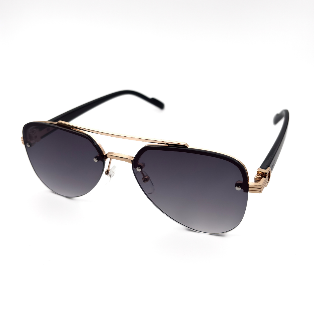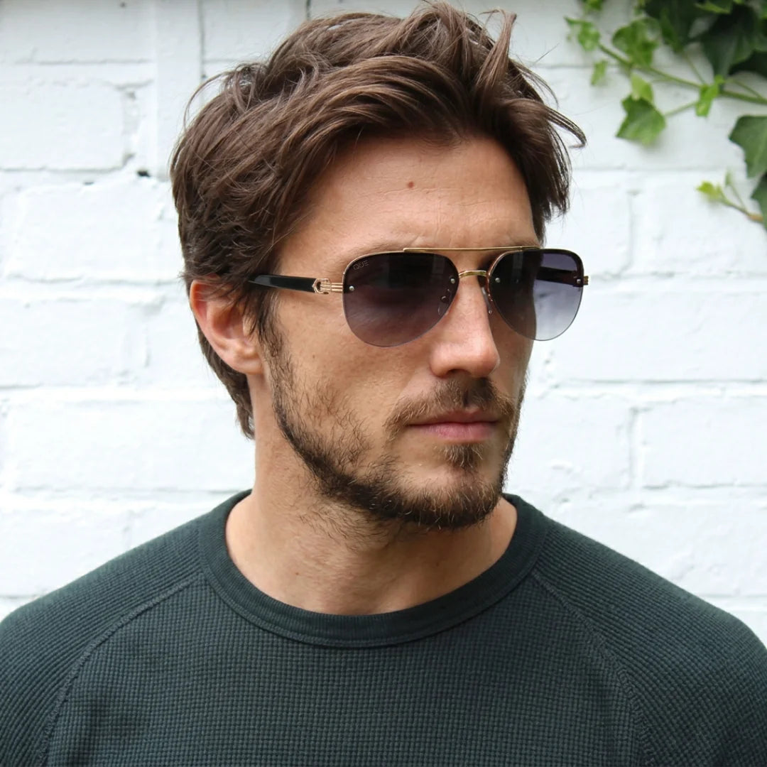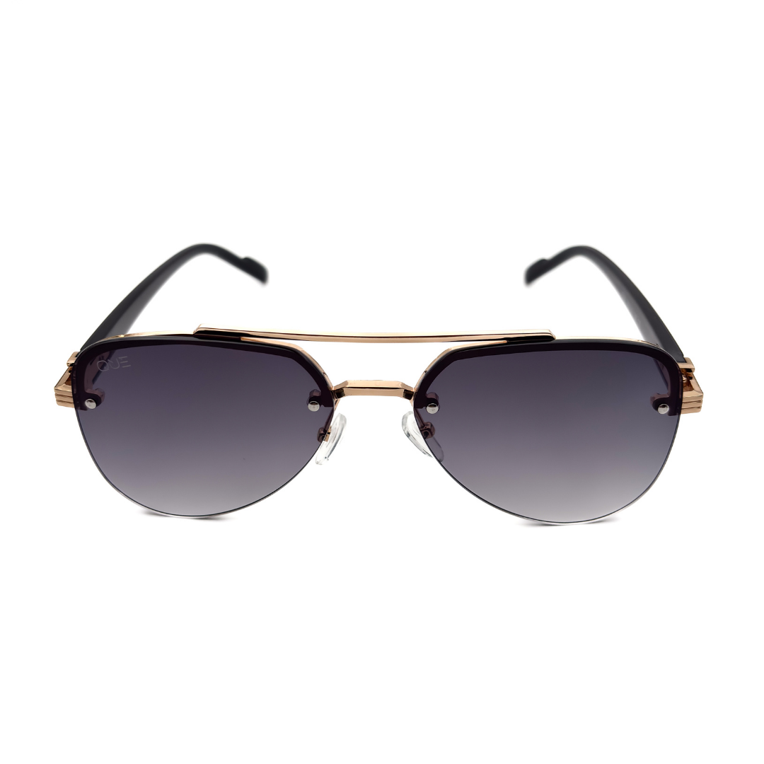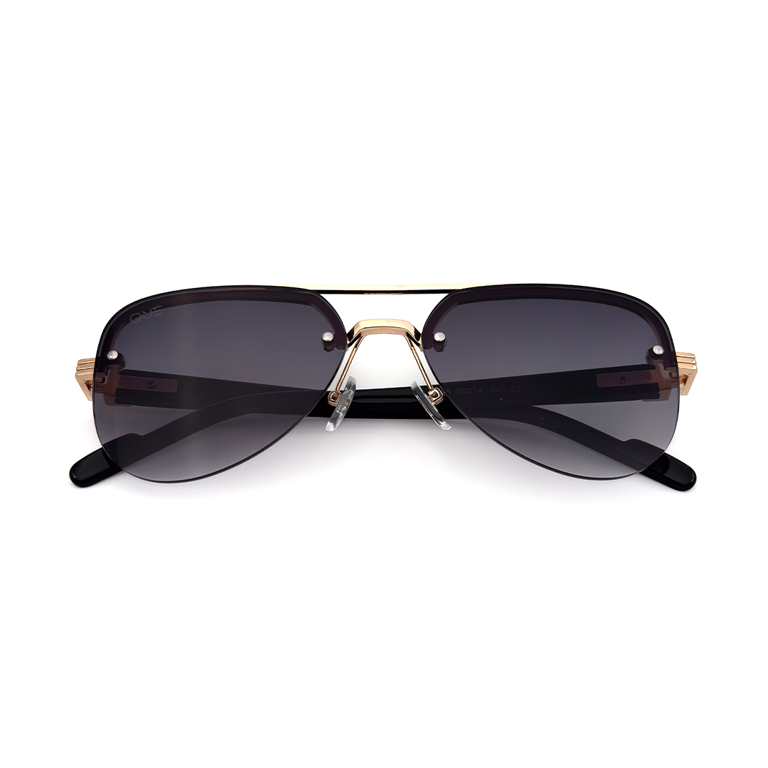 Que Muse sunglasses feature a refined gold metal frame with a bold structured top bar and deep gradient lenses. A modern take on the classic aviator, designed for those who move with quiet confidence.